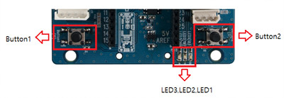 OpenCM 485 확장보드에는 OpenCM9.04의 IO핀과 연결된 버튼 2개와 LED 3개가 제공됩니다. 각 버튼 및 LED와 연결된 OpenCM9.04의 IO 핀번호는 아래의 표에서 확인할 수 있습니다.