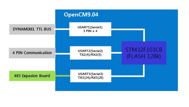 OpenCM 485 확장보드의 TTL/485 버스는 OpenCM9.04의 USART3(Serial3)을 통해서 다이나믹셀 버스가 구성됩니다.