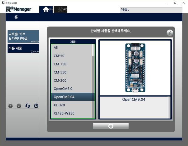 R+ Manager를 실행 후, 홈 탭에서 OpenCM 9.04를 선택하세요.