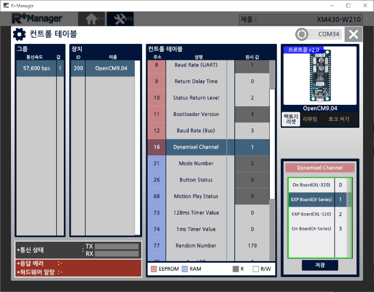 컨트롤 테이블이 활성화 되면, 16번 Dynamixel Channel 주소에서 원하는 항목으로 변경 후 저장하세요. 예를 들어, 확장 보드에서 다이나믹셀 X시리즈를 사용하기 위해서는 EXP Board(X-Series) 을 선택 합니다.