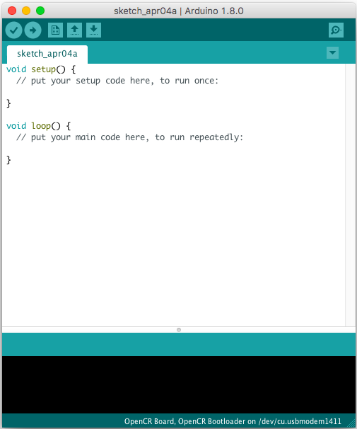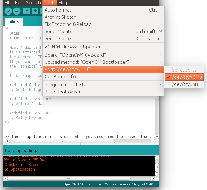 USB를 통해, PC와 OpenCM9.04를 연결한 후, 업로드 버튼을 클릭하세요. 업로드를 시작할때, 보드가 아래처럼 부트로터 (Bootloader)에 진입하는지, 콘솔/메시지 창에서 확인해주세요. 부트로더에 진입하지 못하는 경우, 코드 업로드가 정상적으로 되지 않을수 있습니다.