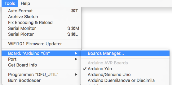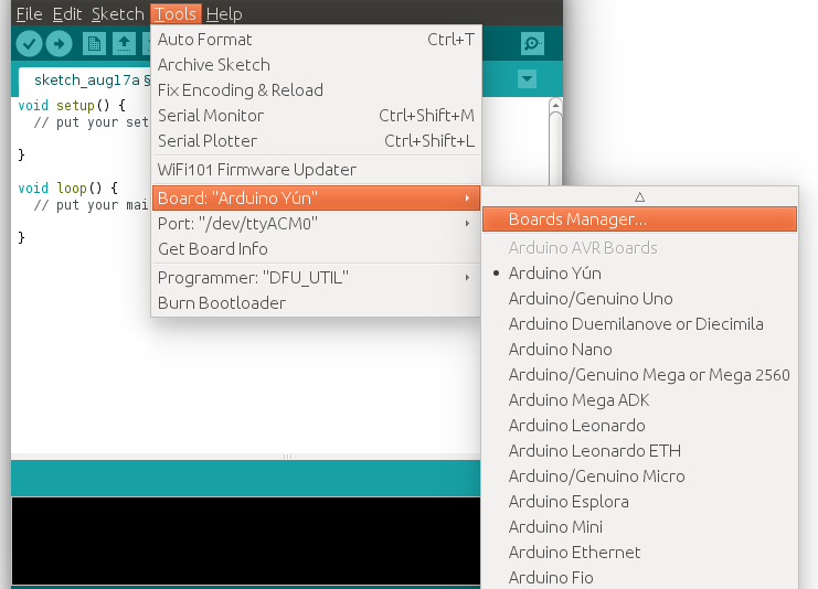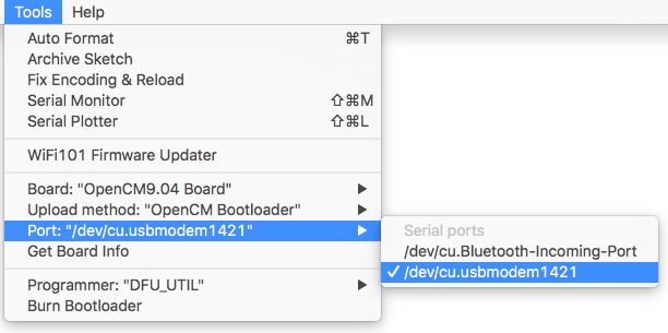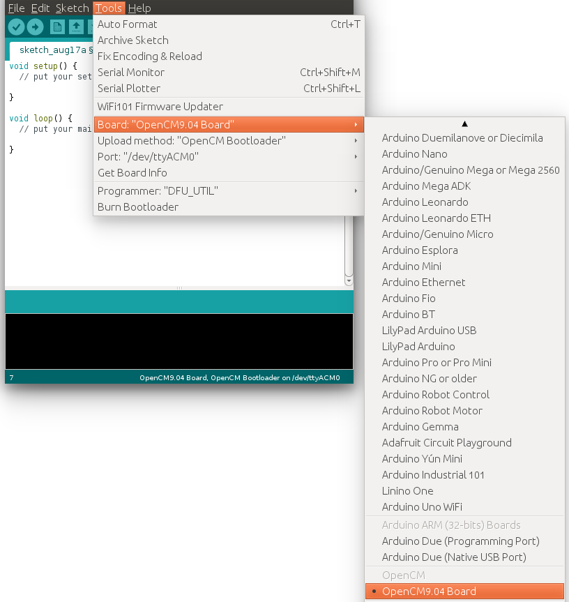 Tools > Port > /dev/ttyACM0를 선택하십시오.