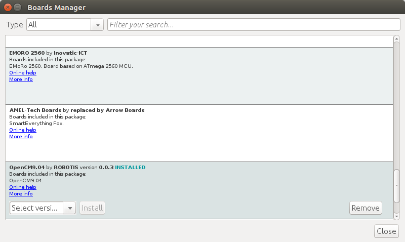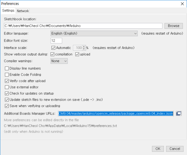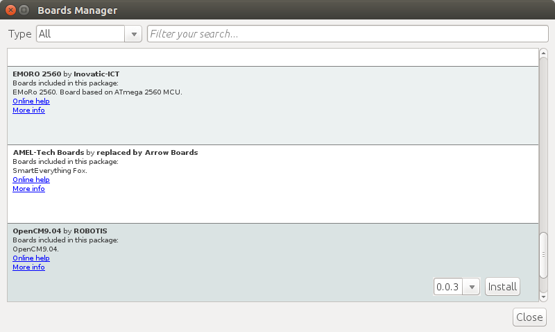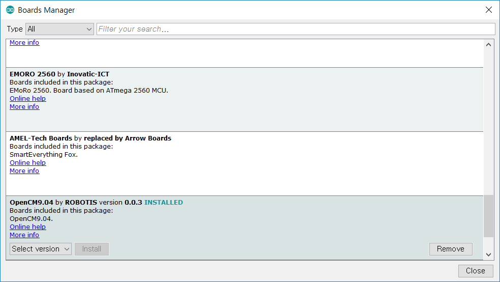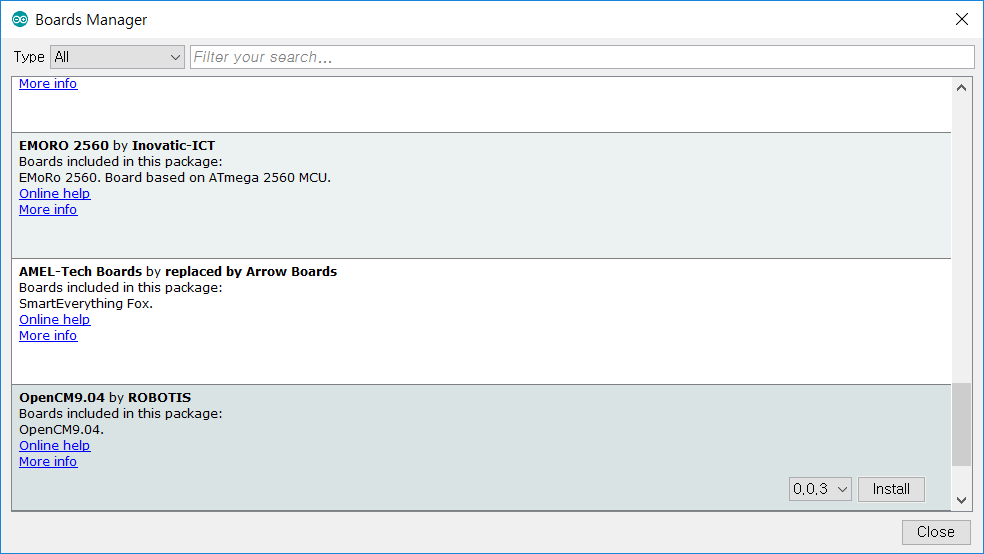 보드 매니저를 통해 OpenCM9.04 패키지 설치하기 (윈도우즈)