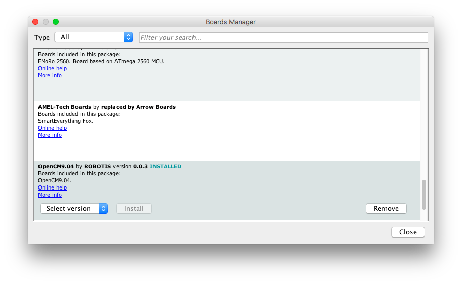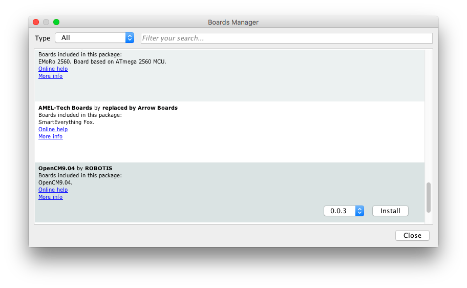 보드 매니저를 통해 OpenCM9.04 패키지 설치하기 (맥)