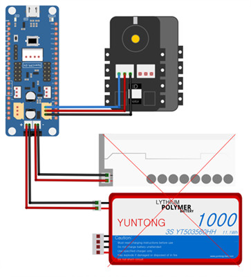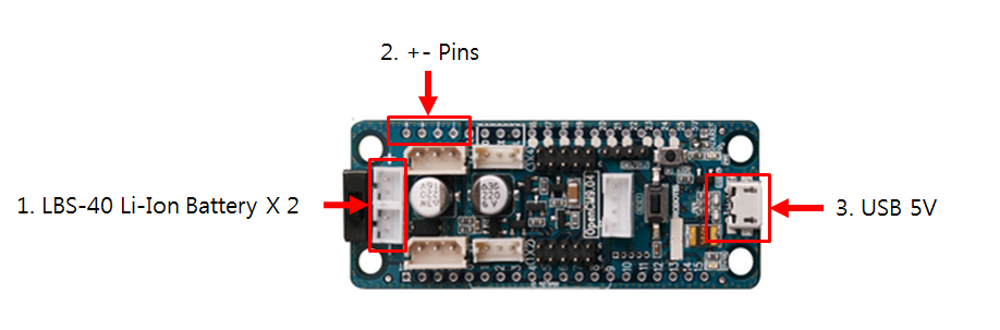 (OpenCM9.04 는 USB나 배터리 또는 + - 터미널 중에 하나 이상의 전원이 공급되면 동작합니다.) - 별도의 전원공급시 연결되는 주변장치의 동작전압을 확인해주세요. 제어기에 입력된 전압이 다이나믹셀에 바로 공급됩니다.