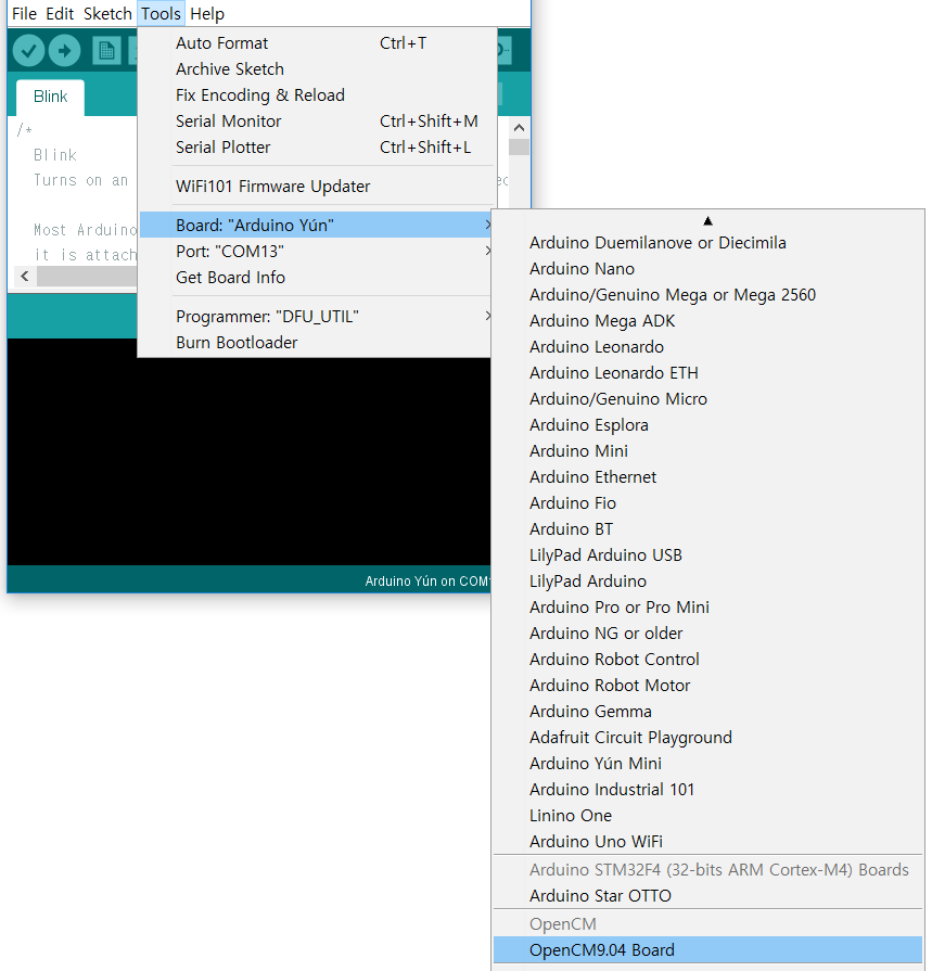 Tools > Board에서 OpenCM9.04 보드가 보이는지 확인하십시오. OpenCM9.04 관련 소스를 불러오기 위해서는 OpenCM9.04 보드를 선택해야 합니다.