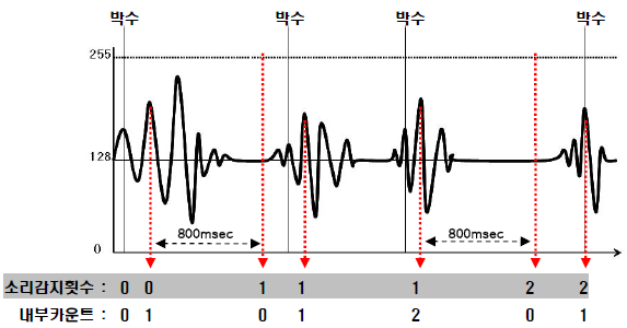 소리감지 횟수가 증가된 시점을 알 수 있도록 하기 위해 내부적으로 카운트를 하고 있다가, 800msec가 지난 후 소리감지 횟수에 값을 저장해 주면서 내부 카운트는 0으로 초기화됩니다. 아래 그림을 보면 좀더 이해하기 쉬울 것입니다.