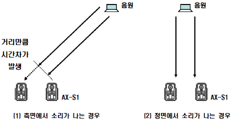 정면일 경우에는 거의 같은 시간으로 감지되겠지만, 측면에 음원이 있을 경우 AX-S1의 떨어진 거리에 비례하는 시간차가 발생합니다. 이것을 가지고 음원의 방향을 대략적으로 추정할 수 있습니다. 아래 그림을 보면 쉽게 이해할 수 있습니다.