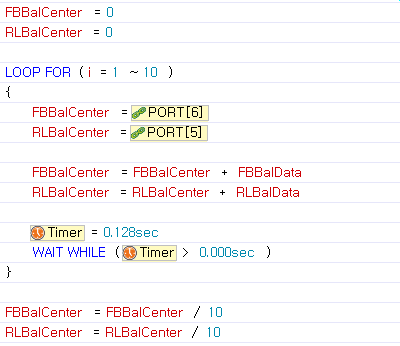 다음과 같이 샘플링을 할 수 있습니다. 약 0.1초마다 10회 값을 읽어서 평균을 내고, 그 값을 기준값으로 사용합니다.