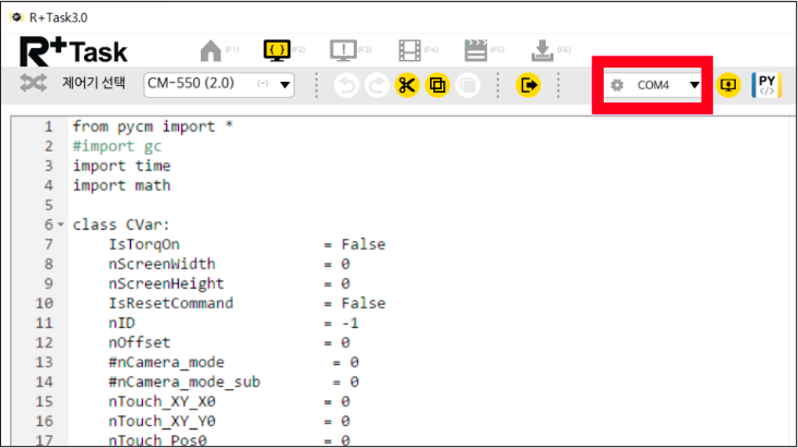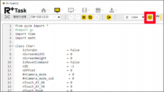 Python 편집창에서 예제 프로그램 코드가 열린 것을 확인한 후 장치 선택을 클릭합니다.