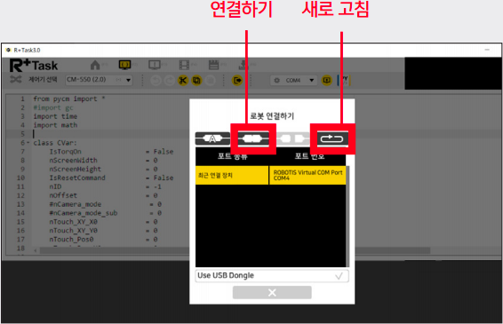 로봇 연결하기 창이 나타나면 새로 고침을 눌러 검색된 장치를 선택하고 연결하기를 누릅니다.