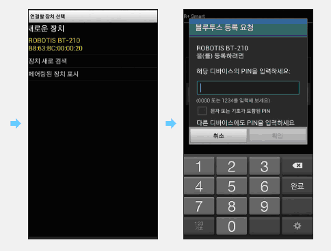 3. 연결이 되면 태스크로 작성한 화면이 표시됩니다.(만약 PIN 넘버를 입력하는 화면이 나오면 0000을 입력합니다.)