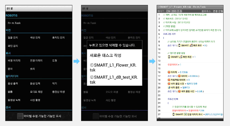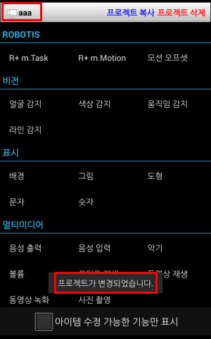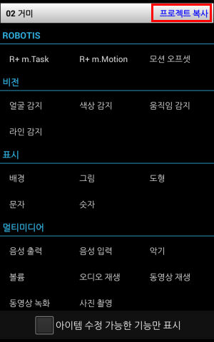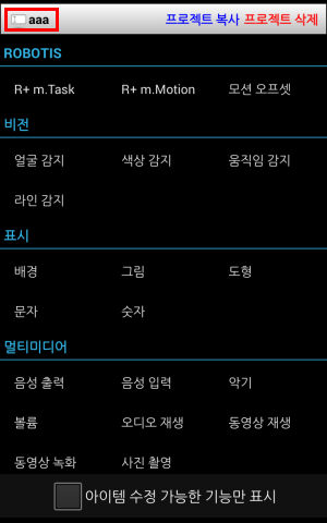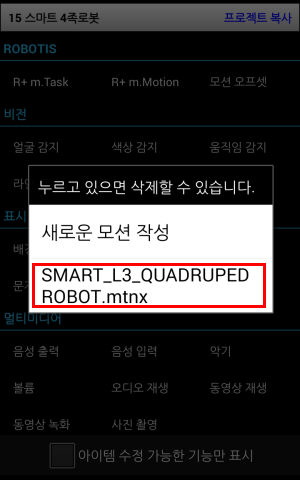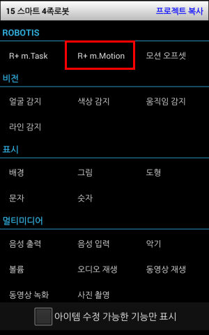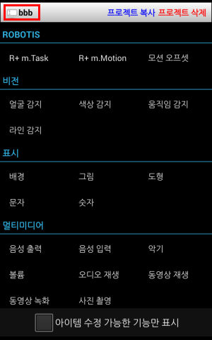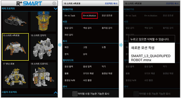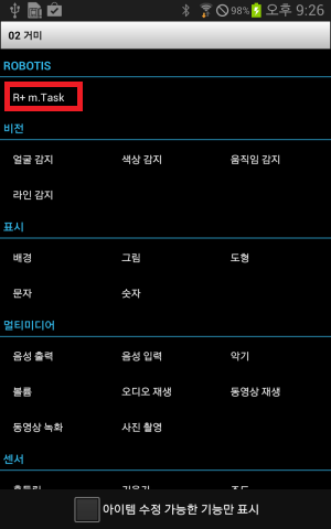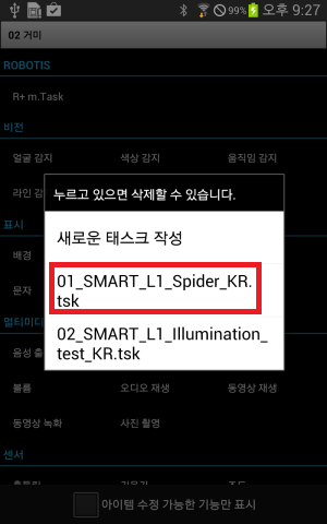 1. R+ SMART 앱을 실행하고 작동하고자 하는 로봇예제 이미지를 길게 누른후 아이템 > R+m.Task 또는 R+m.Task2 를 선택합니다. (스마트3 앱에서는 예제 그림 하단의 편집 버튼을 선택합니다.)