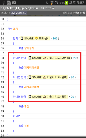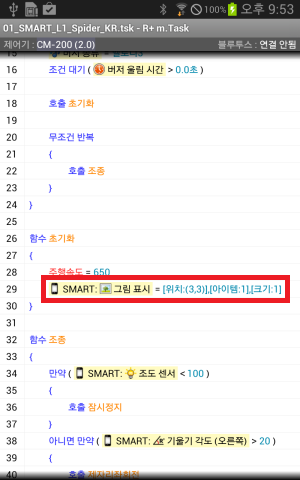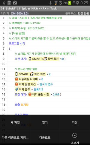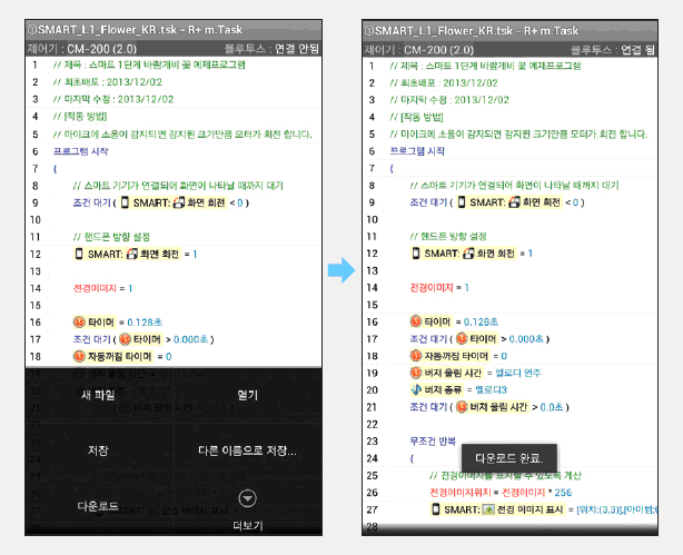 4. 스마트기기의 메뉴를 누르고 “다운로드” 를 누르면 블루투스를 통해 무선으로 연결된 제어기에 task 파일이 다운로드 됩니다.