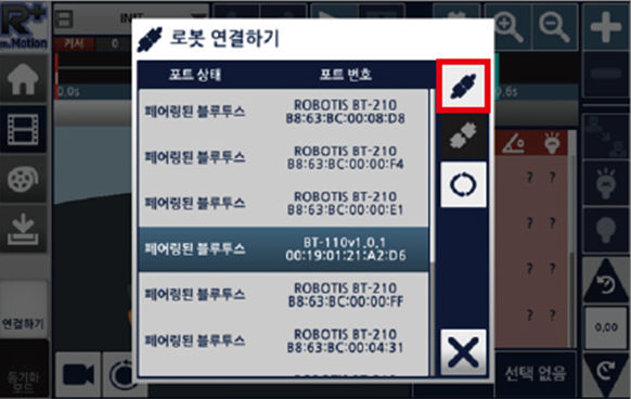 3. 연결할 장치를 선택하라는 창이 뜨면 하단의 목록 중에서 제어기에 연결된 블루투스(BT-210)의 윗면에 있는 번호와 동일한 번호를 선택합니다.