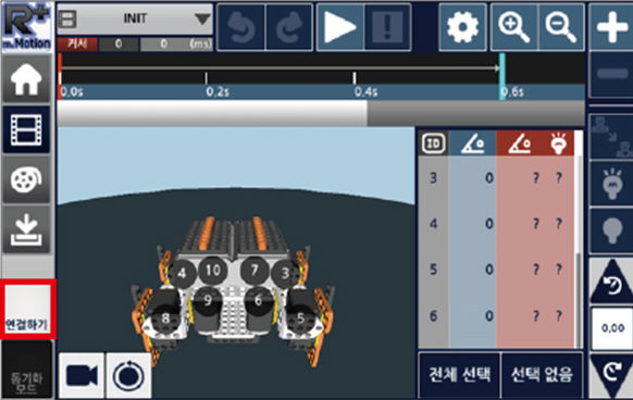 4. 제어기의 전원을 켜고, 화면 왼쪽 아래에 있는 ‘연결’ 버튼을 터치하면 연결할 수 있는 장치의 목록이 나타납니다.