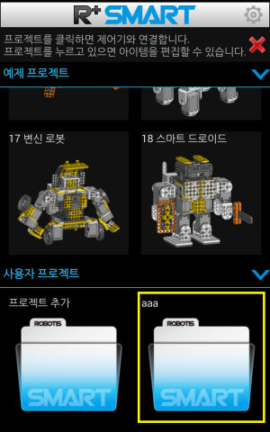 1. 로봇의 시작버튼을 누르고 블루투스를 연결한 후, 해당 프로젝트를 짧게 클릭합니다.