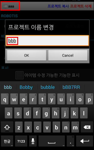 1. 프로젝트를 길게 누르고 있으면 표시되는 기능 확인 및 수정 가능한 화면에서 프로젝트 이름을 클릭합니다. (사용자 프로젝트만 이름을 변경할 수 있습니다.)