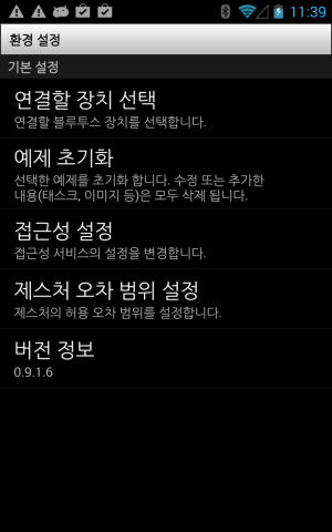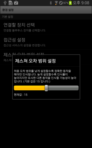 2. 설정화면에서는 연결할 장치, 접근성 서비스, 제스쳐 오차범위 설정을 할 수 있습니다.