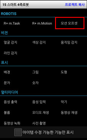 1. 프로젝트를 길게 누르고 있으면 표시되는 기능 확인 및 수정 가능한 화면에서 모션 오프셋을 클릭합니다.