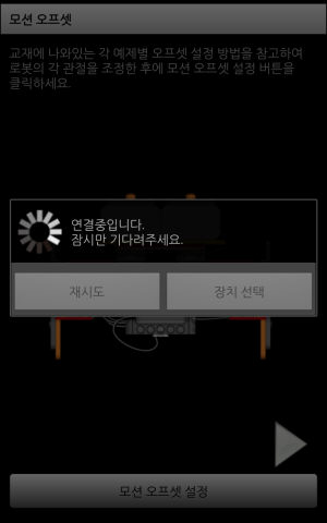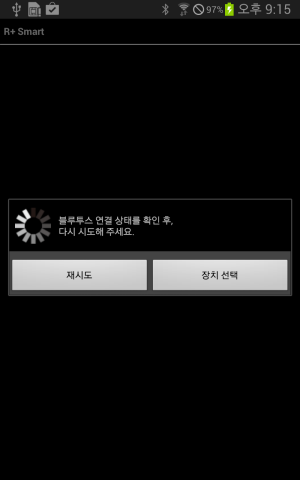 2. 연결이 되지 않는 다면 “재시도”를 클릭하거나 “장치 선택”을 클릭해서 올바른 블루투스를 선택합니다.