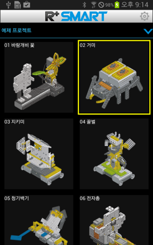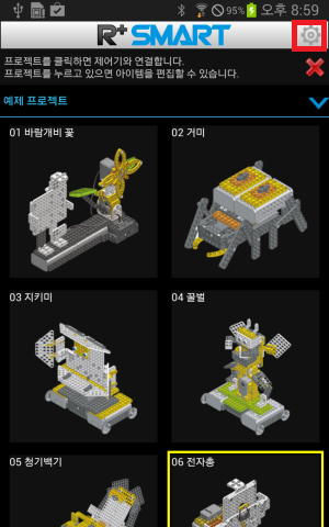 1. R+ SMART 앱을 실행시키고, 작동하고자 하는 예제 그림을 길게 터치합니다. (스마트3 앱에서는 예제 그림 하단의 편집 버튼을 선택합니다.)