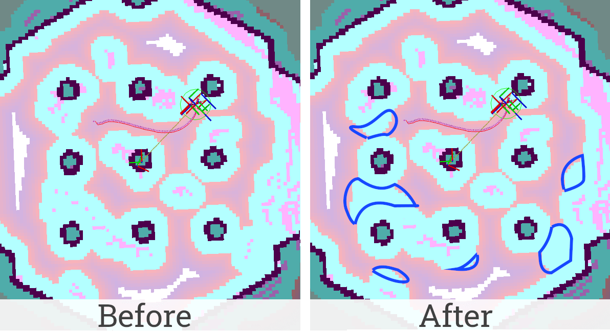 嘈杂的传感器测量可能导致“体素层”或“障碍层”出现错误。因此,代价地图上可能会出现椒盐噪声。这种噪声会产生虚假障碍,阻止机器人在地图上找到最佳路径。虽然上面的图片显示了椒盐噪声以及由于错误定位而导致的错误,但该层只会消除传感器噪声,而不会消除与静态地图错位的错误定位伪影。 本教程介绍如何配置由噪声引起的虚假障碍的过滤。此功能由“DenoiseLayer”代价地图层插件提供,该插件将在本文档中启用和使用。