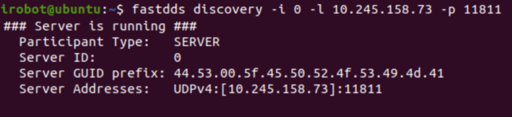 with the computer's IP address. fastdds discovery -i 0 -l <SERVER_IP> -p 11811