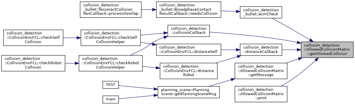 | Get the allowed collision predicate between two elements. Return true if a predicate for entry is included in the collision matrix (if the type is AllowedCollision::CONDITIONAL) or if one was computed from defaults. Return false if the entry is not found. More... | |