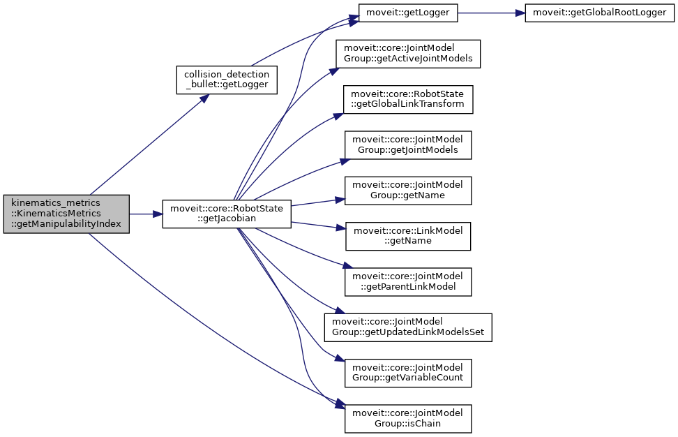 | bool | getManipulabilityIndex (const moveit::core::RobotState &state, const moveit::core::JointModelGroup *joint_model_group, double &manipulability_index, bool translation=false) const |