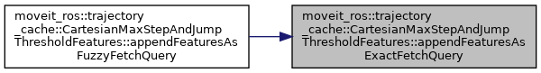 | moveit::core::MoveItErrorCode | appendFeaturesAsExactFetchQuery (warehouse_ros::Query &query, const moveit_msgs::srv::GetCartesianPath::Request &source, const moveit::planning_interface::MoveGroupInterface &move_group, double exact_match_precision) const override |