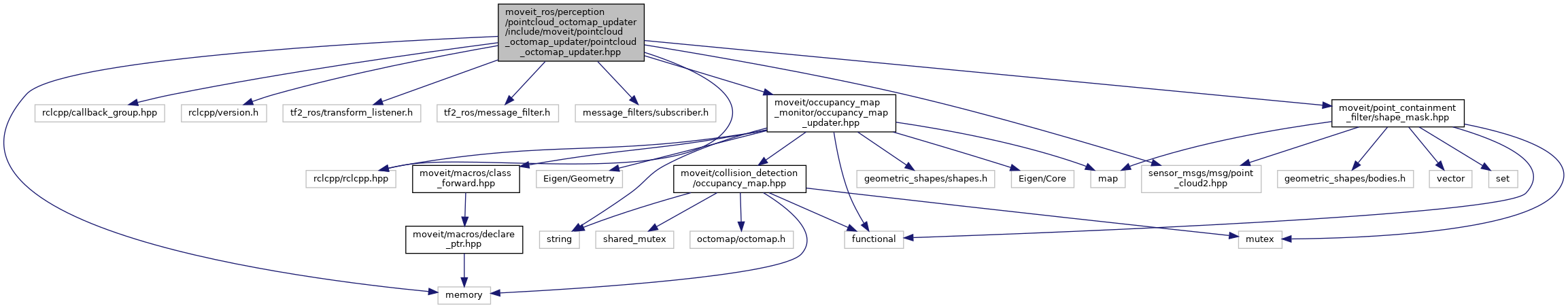 #include <rclcpp/rclcpp.hpp>#include <rclcpp/callback_group.hpp>#include <rclcpp/version.h>#include <tf2_ros/transform_listener.h>#include <tf2_ros/message_filter.h>#include <message_filters/subscriber.h>#include <sensor_msgs/msg/point_cloud2.hpp>#include <moveit/occupancy_map_monitor/occupancy_map_updater.hpp>#include <moveit/point_containment_filter/shape_mask.hpp>#include <memory>