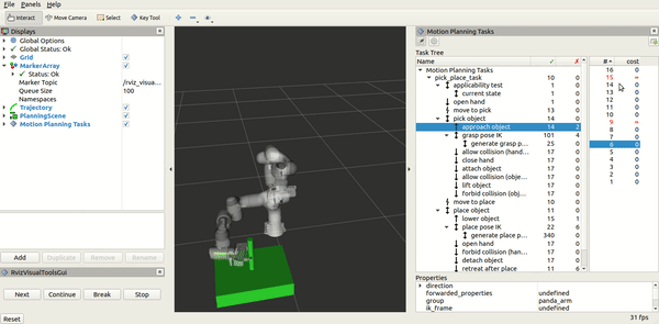 Click one of the solution costs to see an animation of the robot following the plan for that stage. Click the “Exec” button in the upper-right portion of the pane to execute the motion.