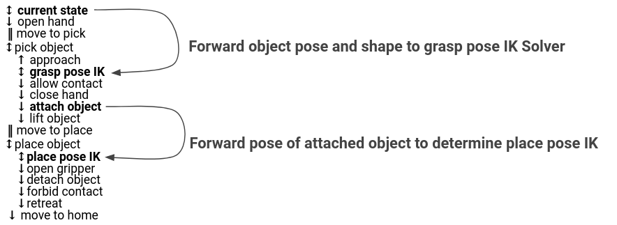 We then create a ComputeIK stage and pass it our GeneratePlacePose stage - the rest follows the same logic as above with the pick stages.
