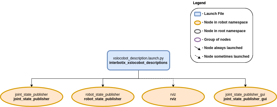 This package contains the xslocobot_description.launch file responsible for loading parts or all of the robot model. It launches up to four nodes as described below: