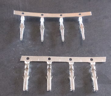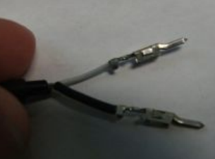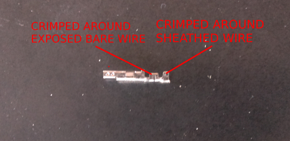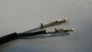 Next, crimp the pins to the sheathed wire, as shown below. This will require a slightly larger size on the crimp tool.