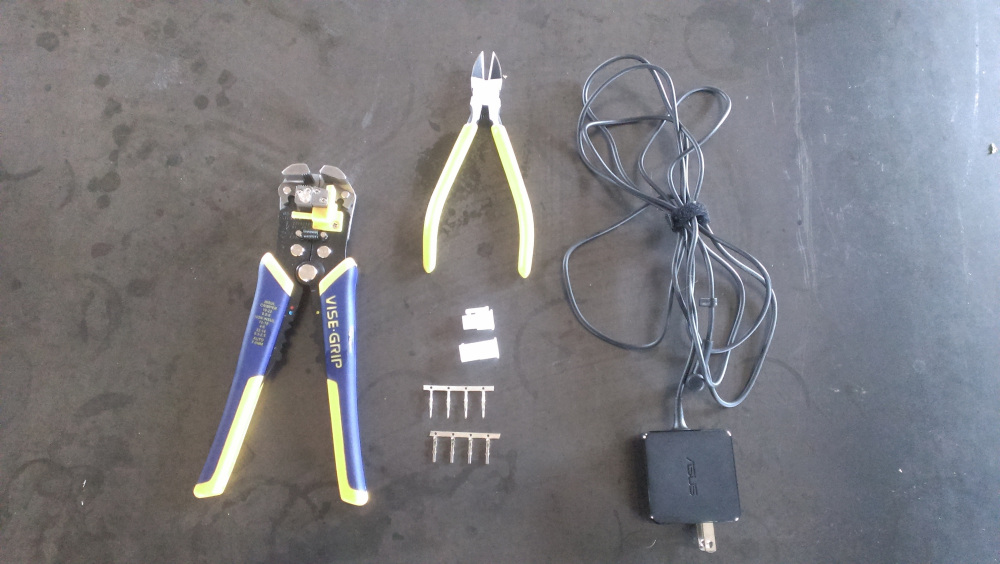 Wire Stripper / Crimper (Left), Side Cutter (top, center) and Unmodified Laptop Power Cable (Right)