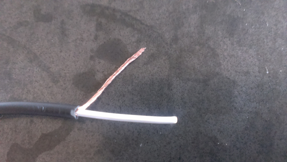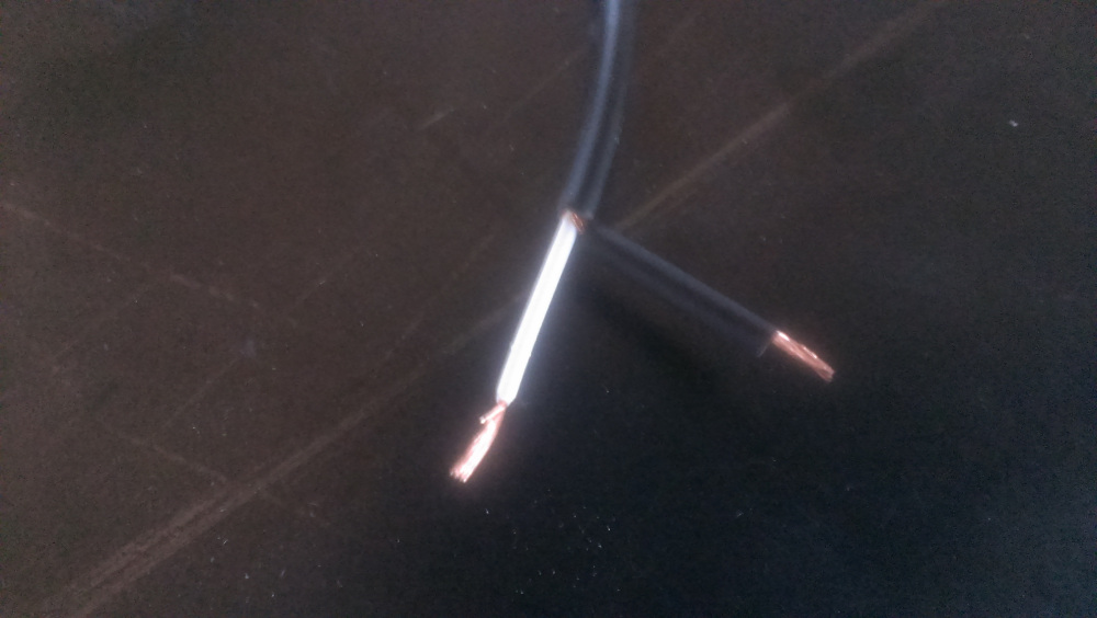 You will see a white sheathed wire, and a bunch of bare wires. Aggregate the bare wires into a group and twist them together as shown below. Do this for both pieces.