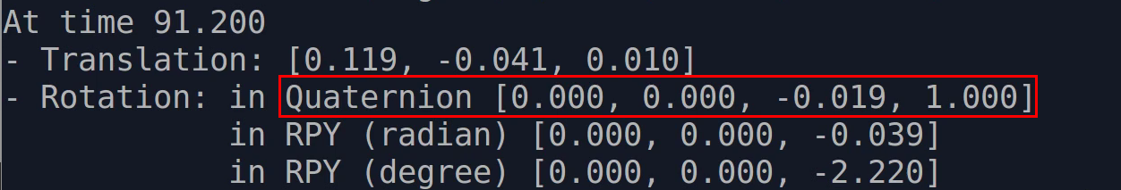 We are interested in four numbers in quaternion (current rotation). We will send a goal to change position with approximately the same rotation. Note four numbers: [0, 0, 0, 1].