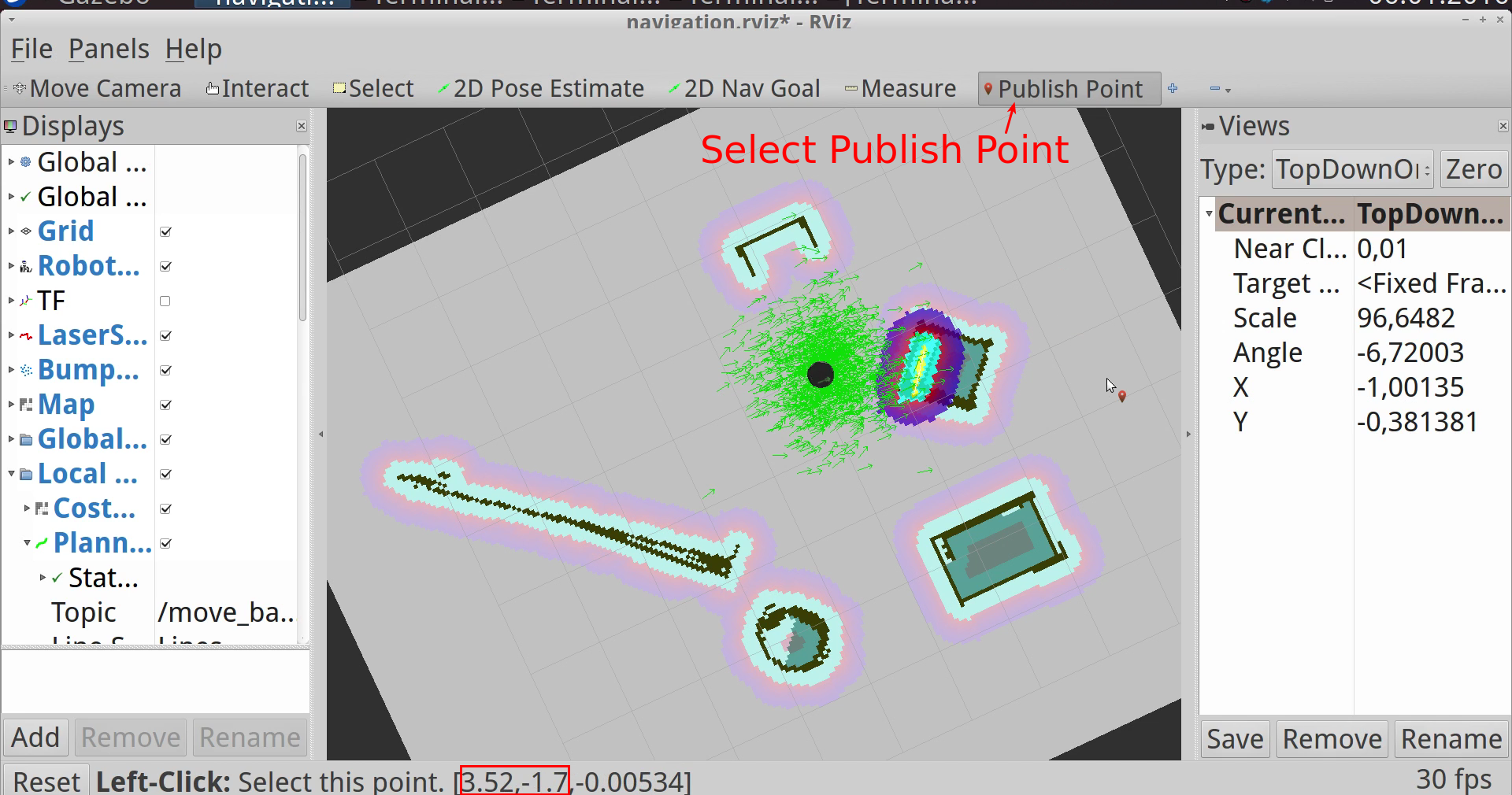 Select Publish point and choose a point on map where you want TurtleBot to go (do not click). You should note two numbers you see on the bottom left corner of Rviz window. Look at the picture: