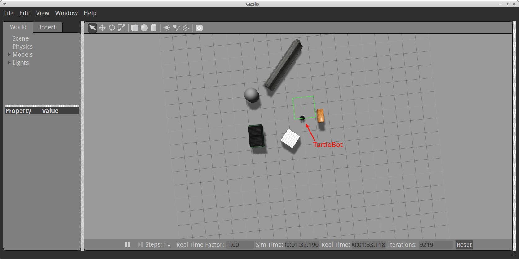 You would see an environment, called a Gazebo world, with TurtleBot and some other objects. The scene is the main part of the simulator where objects are animated and you are able to interact with the environment.
