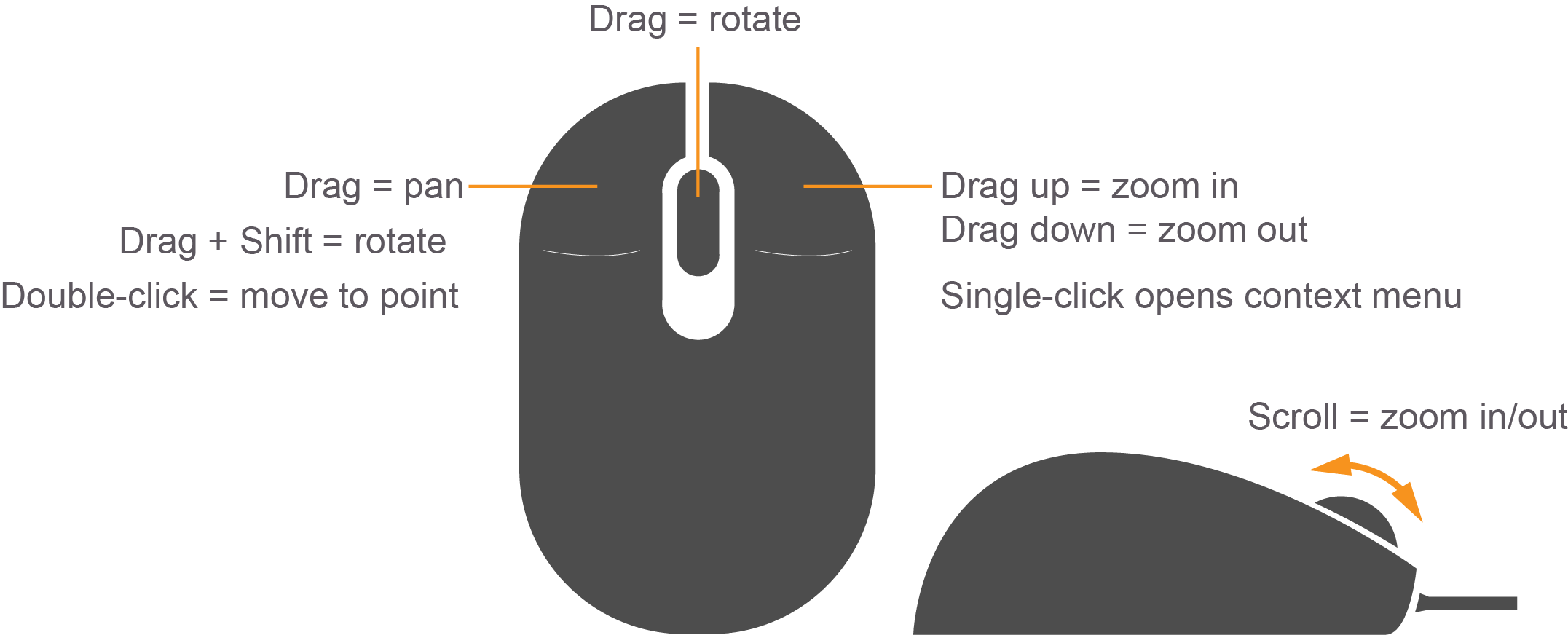 We highly recommend using a mouse with a scroll wheel. You can see the basic mouse operations for navigating in the scene and changing the view angle below: