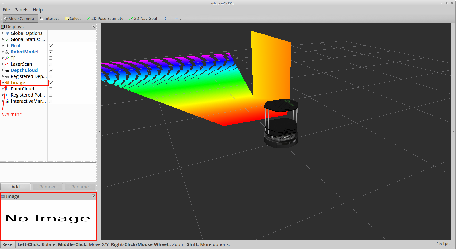 NOTE: You will probably have a warning on this step. The problem is that the default topic for image is not supported by simulation. You can see an image with warning below. Go to the next step to choose appropriate topic.