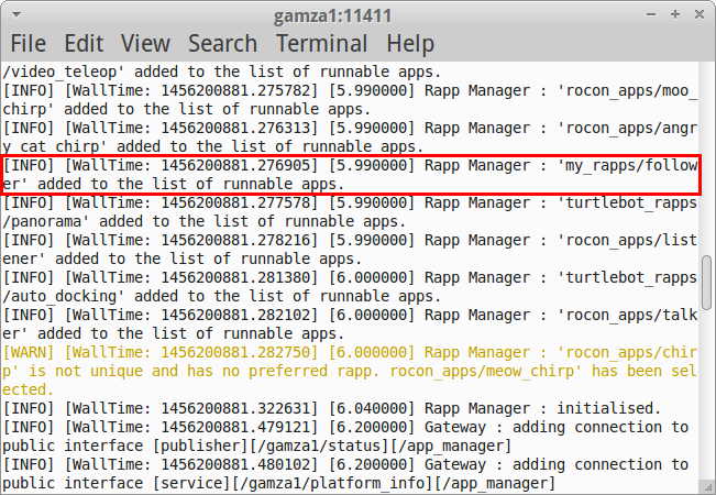 [INFO] [WallTime: 1456201608.858627] [15.600000] Rapp Manager : starting app 'my_rapps/follower' underneath gamza2NOTE: Only one rapp can be run at one time, otherwise a resource conflict might occur.