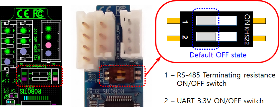 If communication is suffering from frequent errors, the termination resistor might be required. The regular 120Ω termination resistor will be applied on the transmission line by shifting the switch to ON. If termination resistor doesn’t resolve the communication issue, the resistance value might need to be adjusted.