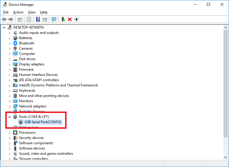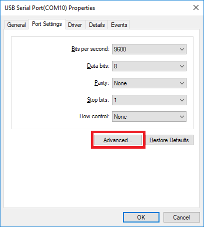 Device Manager. Go toPortsitem and right click on the relative serial port to selectProperties.