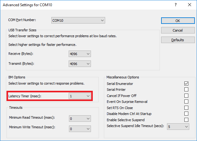 NOTE : For the stable communication with higher baudrate, configure USB Latency value to the lower.